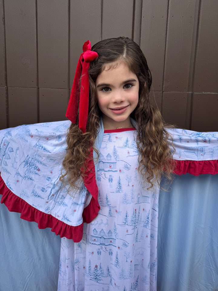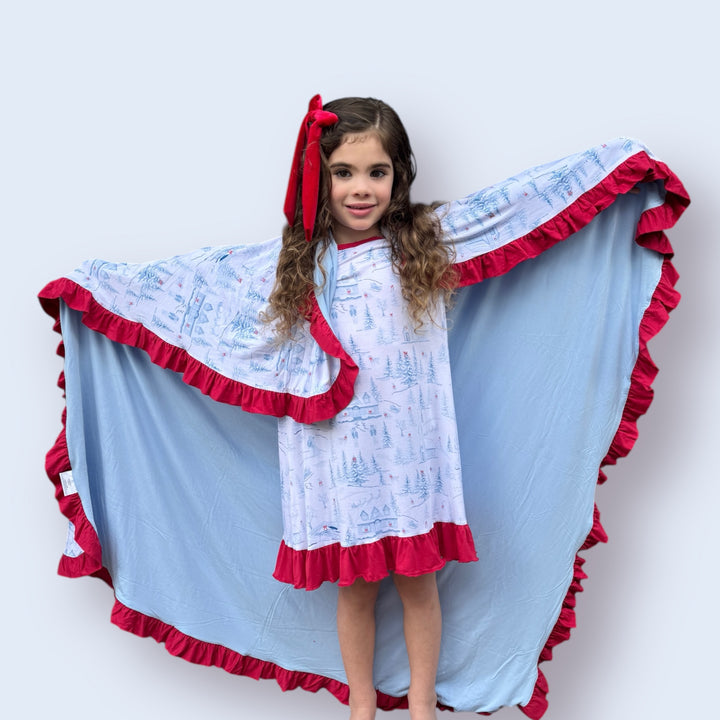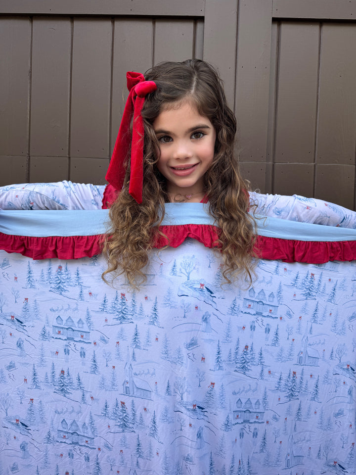 The blanket that will be fought over from kids and adults alike. It’s cooling, yet snuggly. It is the perfect weight and warmth for lounging or sleeping with. The ruffled trim elevates the look for the perfect statement piece when not in use. We searched high and low for the highest quality, softest, most buttery feeling fabric there is. Our Holiday Toile print is Grandmillennial at its finest! These fabric designs are exclusively by us and for us and only found here.