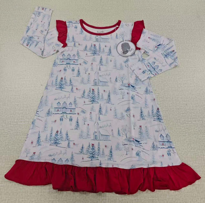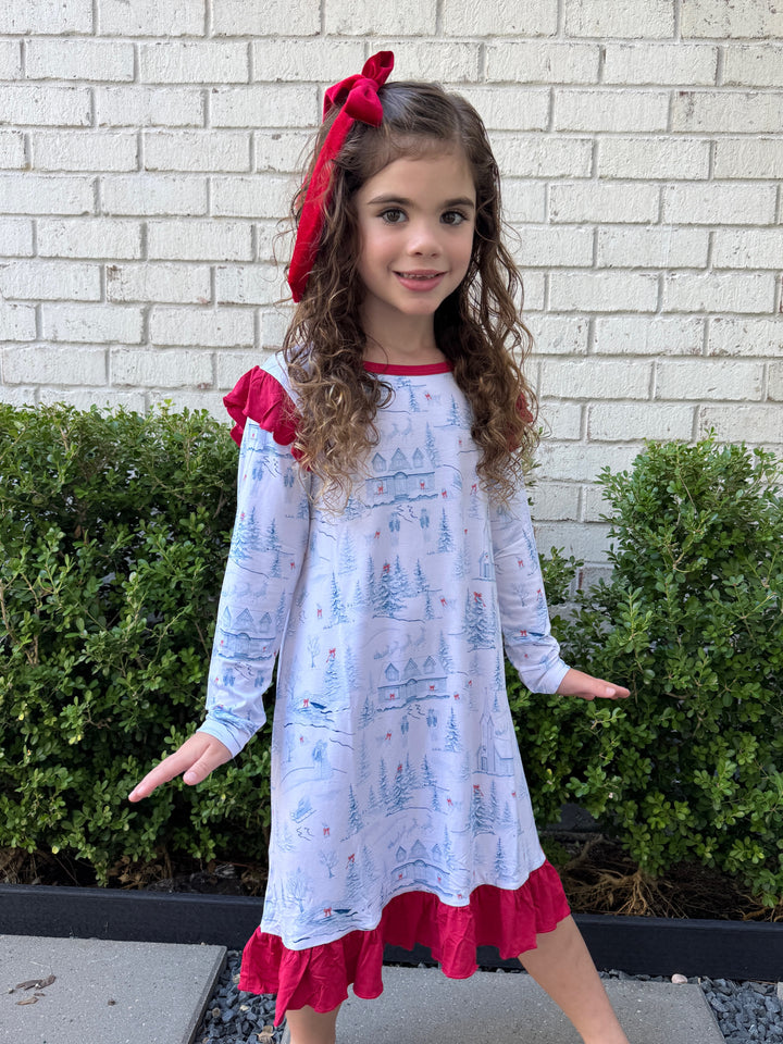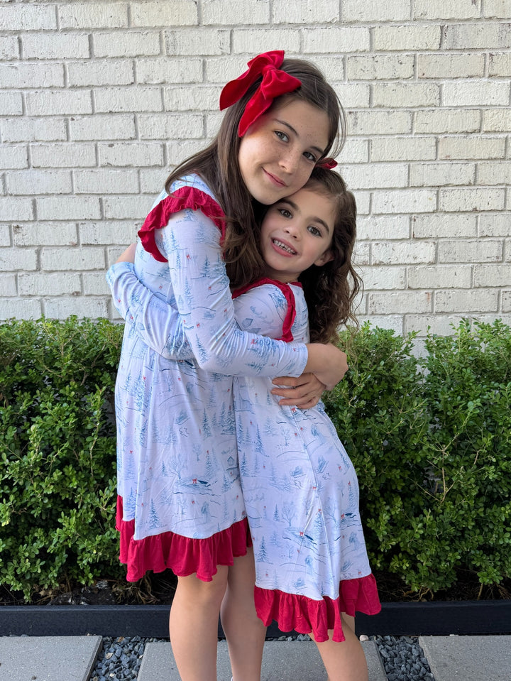 Our long sleeved nightgown with contrasting ruffled shoulders and trim is so effortlessly beautiful. We searched high and low for the highest quality, softest, most buttery feeling fabric there is. Our Holiday Toile print is Grandmillennial at its finest! And these designs are exclusively by us and for us and only found here.Â